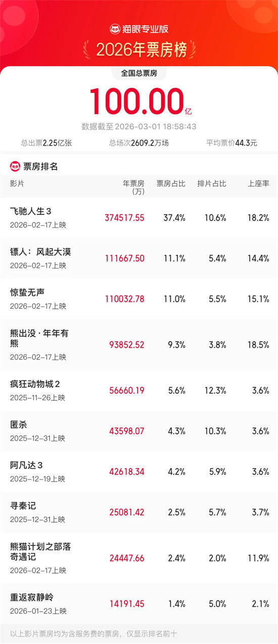 2026年中国电影票房突破100亿!